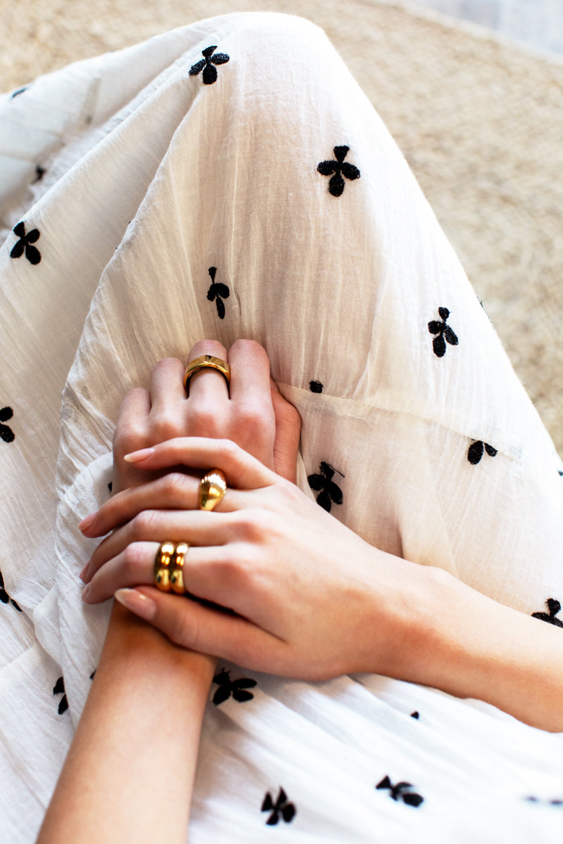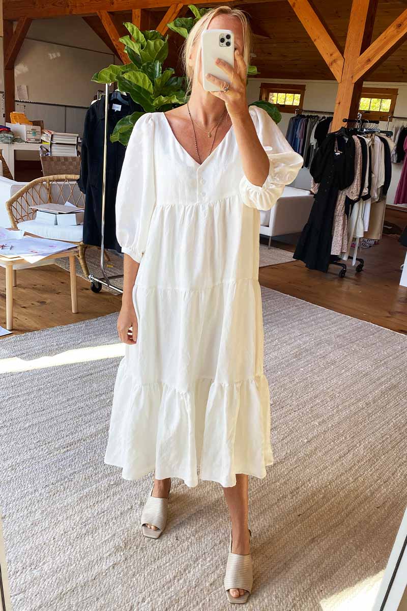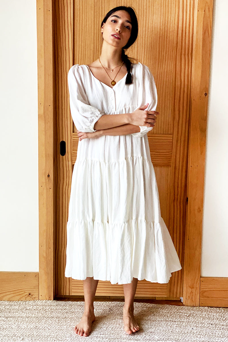 Organic Cotton Hand Embroidered Adjustable tie at shoulder Shirred elastic panel at back Princess seams at bust Tiered skirt Lined Made in Rajasthan, India XS: Bust 30", Length 48.5" S:...
