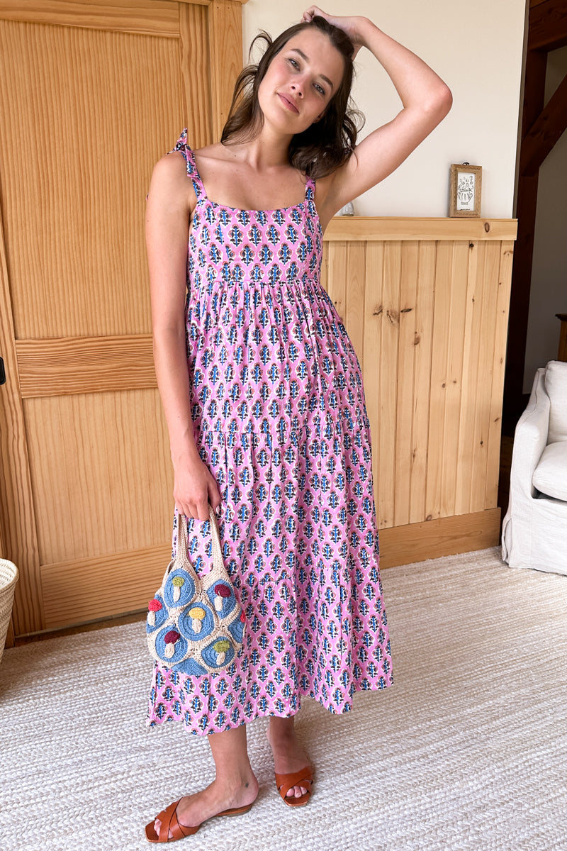 Organic Cotton Hand block printed with low impact dye Adjustable tie at shoulder Shirred elastic panel at back Princess seams at bust Tiered skirt Lined Made in Rajasthan, India XS:...