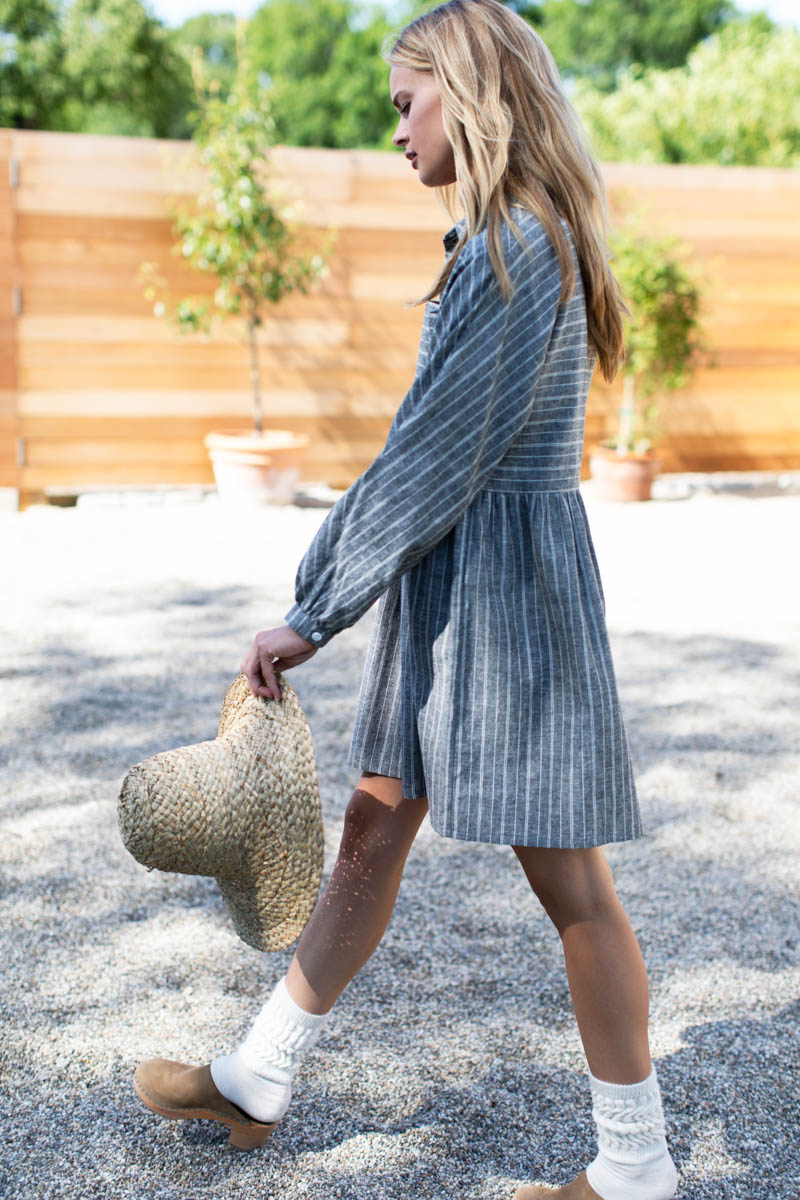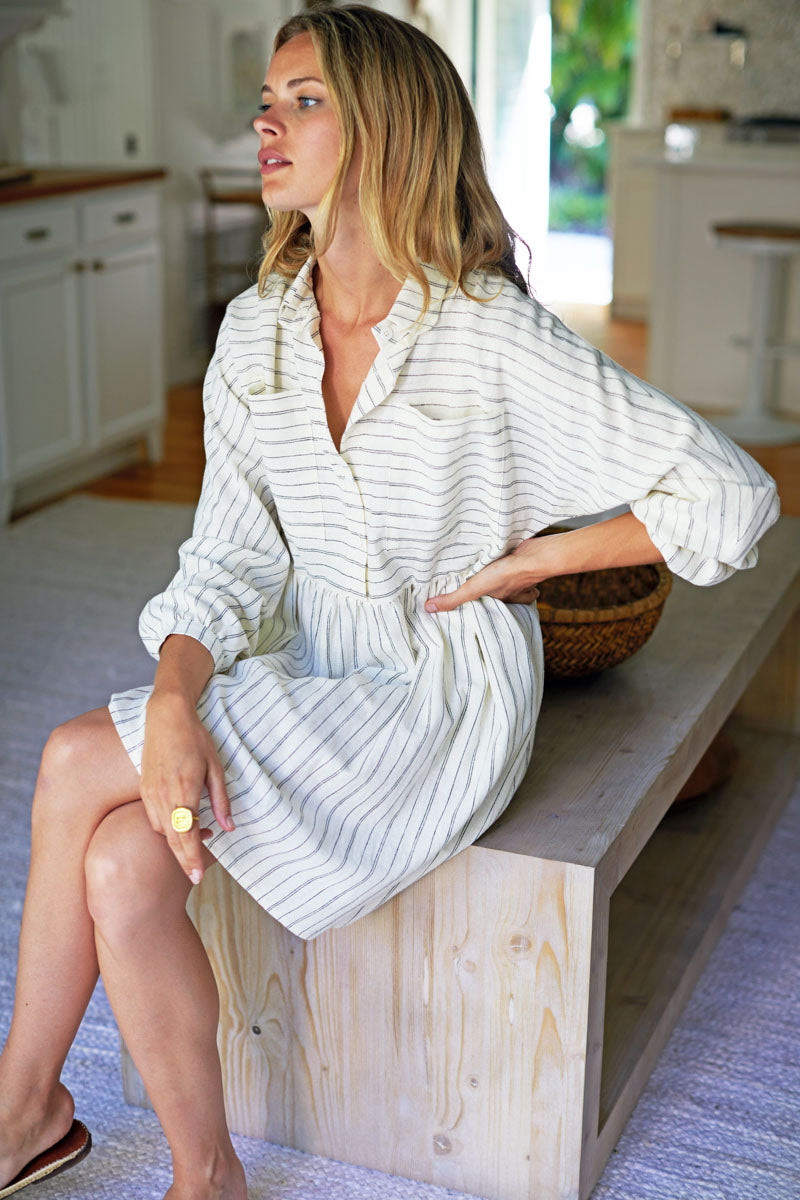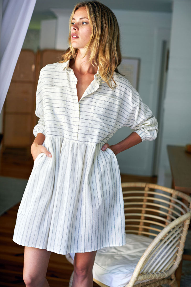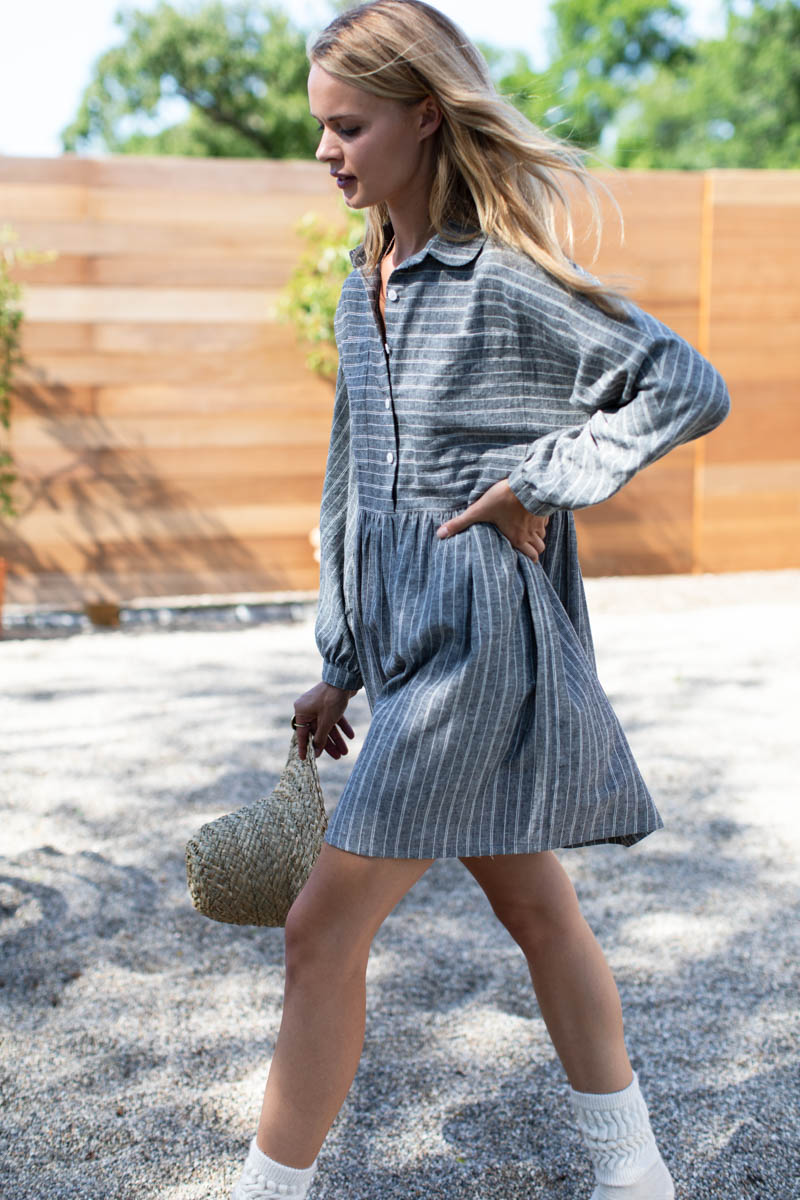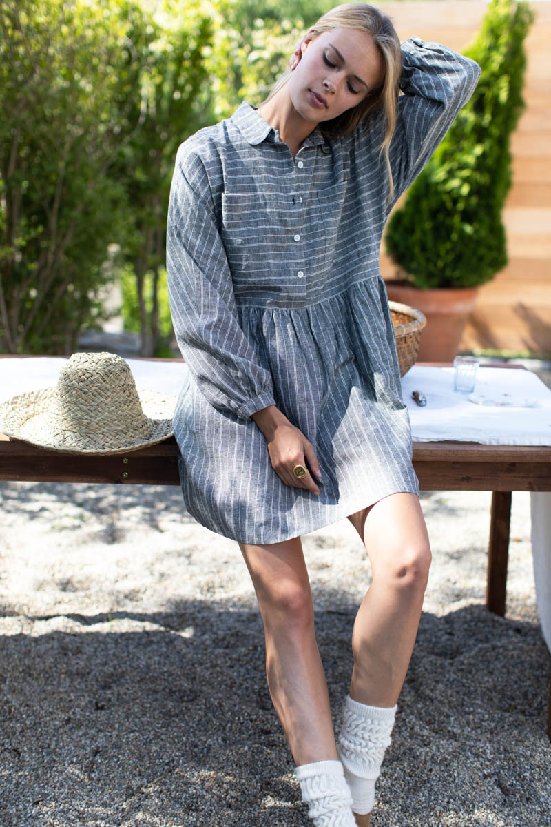 Flax Stripe Elastic shirred bust with adjustable tie shoulders Button front skirt Lined Hand wash, line dry Made in Rajasthan, India