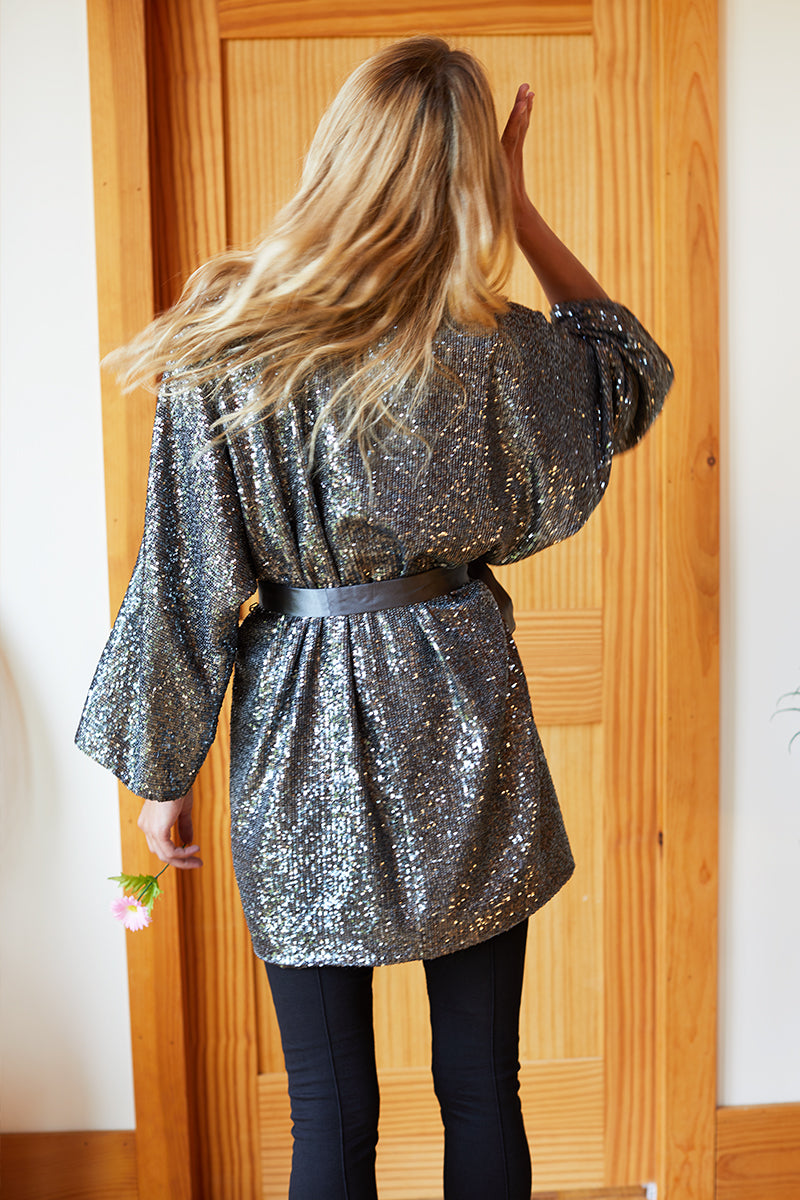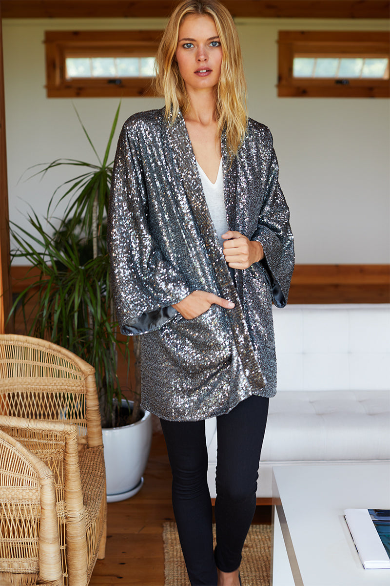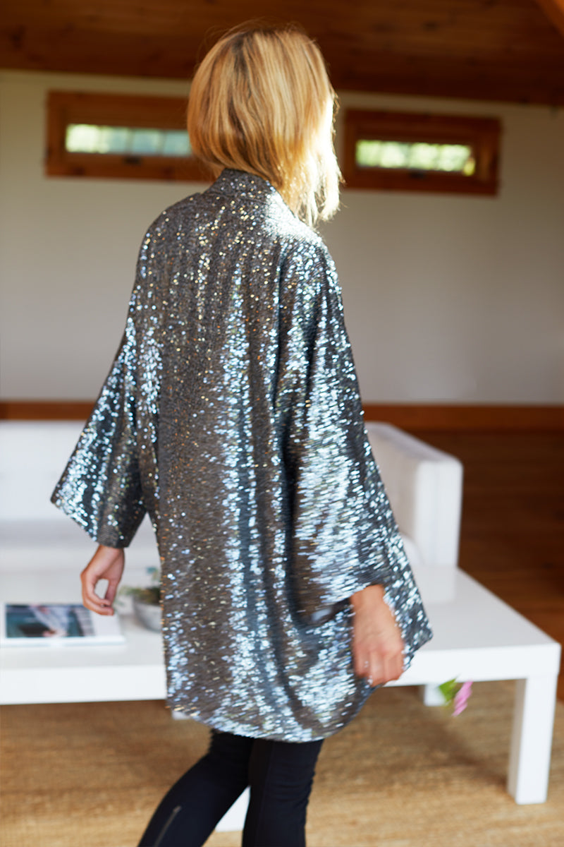 Back by popular demand + without a doubt, an EF staff favorite. A sequin Kimono sleeve jacket in beautiful complex gunmetal tones. Anytime you put this on, even just around...