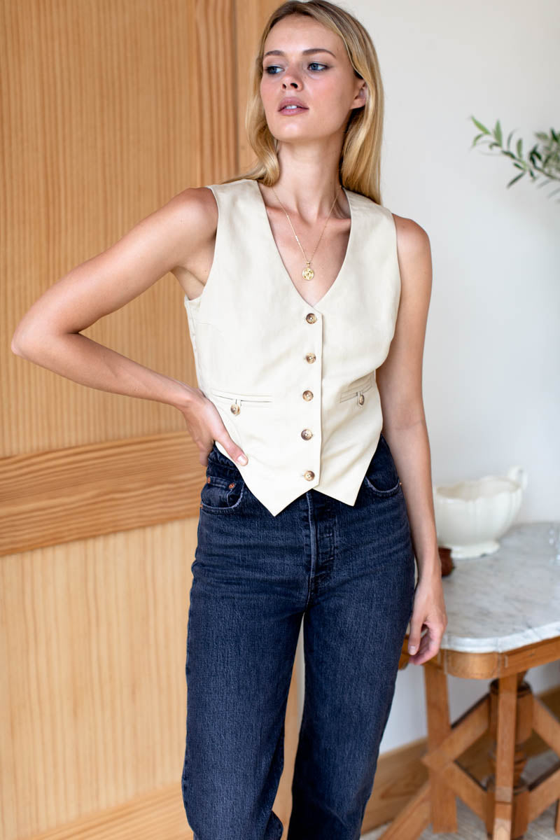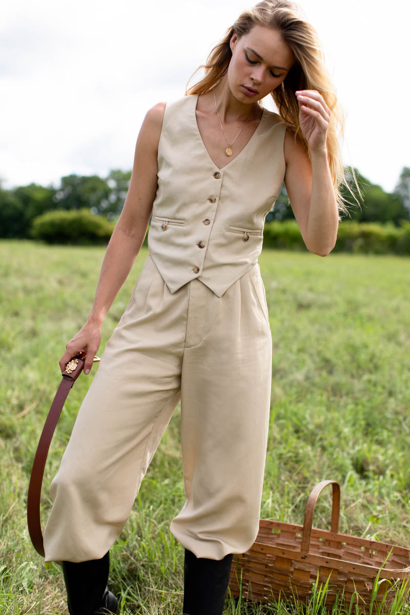 Tencel Linen Twill Tailored fit Darts at bust Tortoise button down front Angled cut at waist makes for flattering shapes Welt pockets on front with button closure Made in NYC...