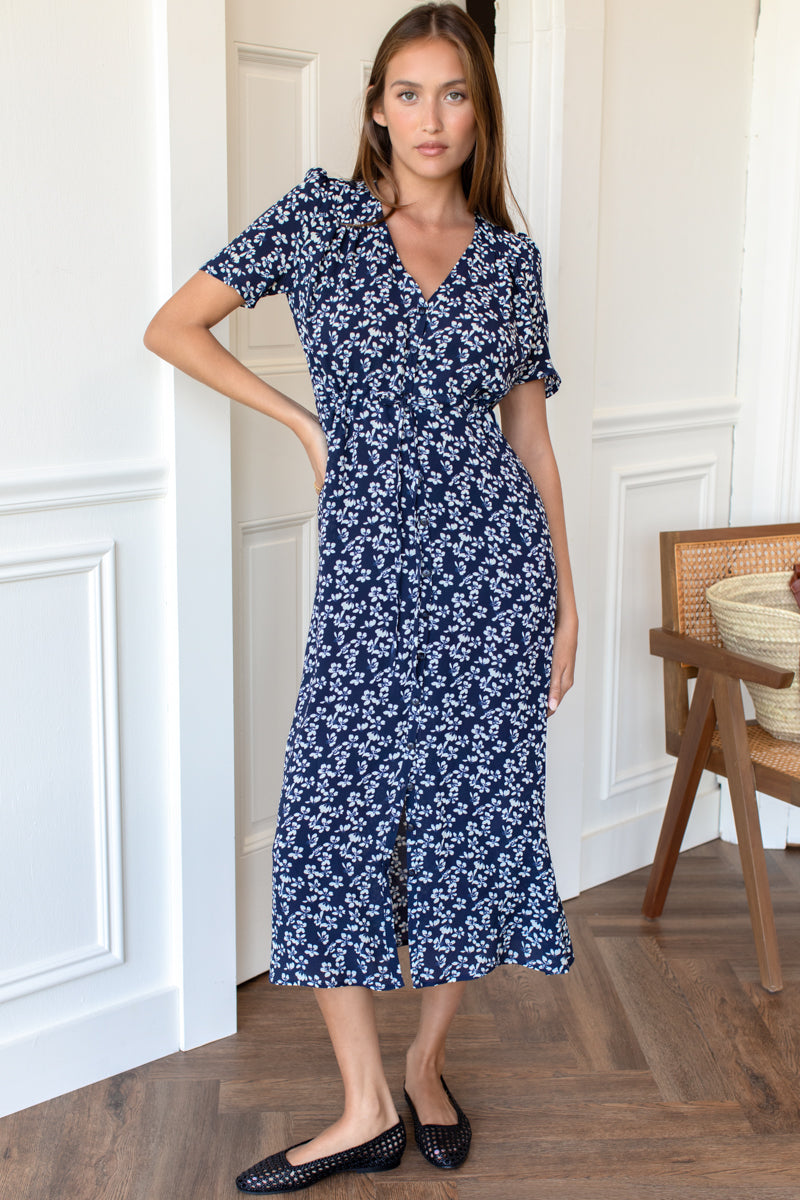 Eco Viscose Button front w/ drawstring waist Button closure at cuff Midi length dress 48" (size small) Inset little puff shoulder Gathers at collar and back yoke Made in NYC ...