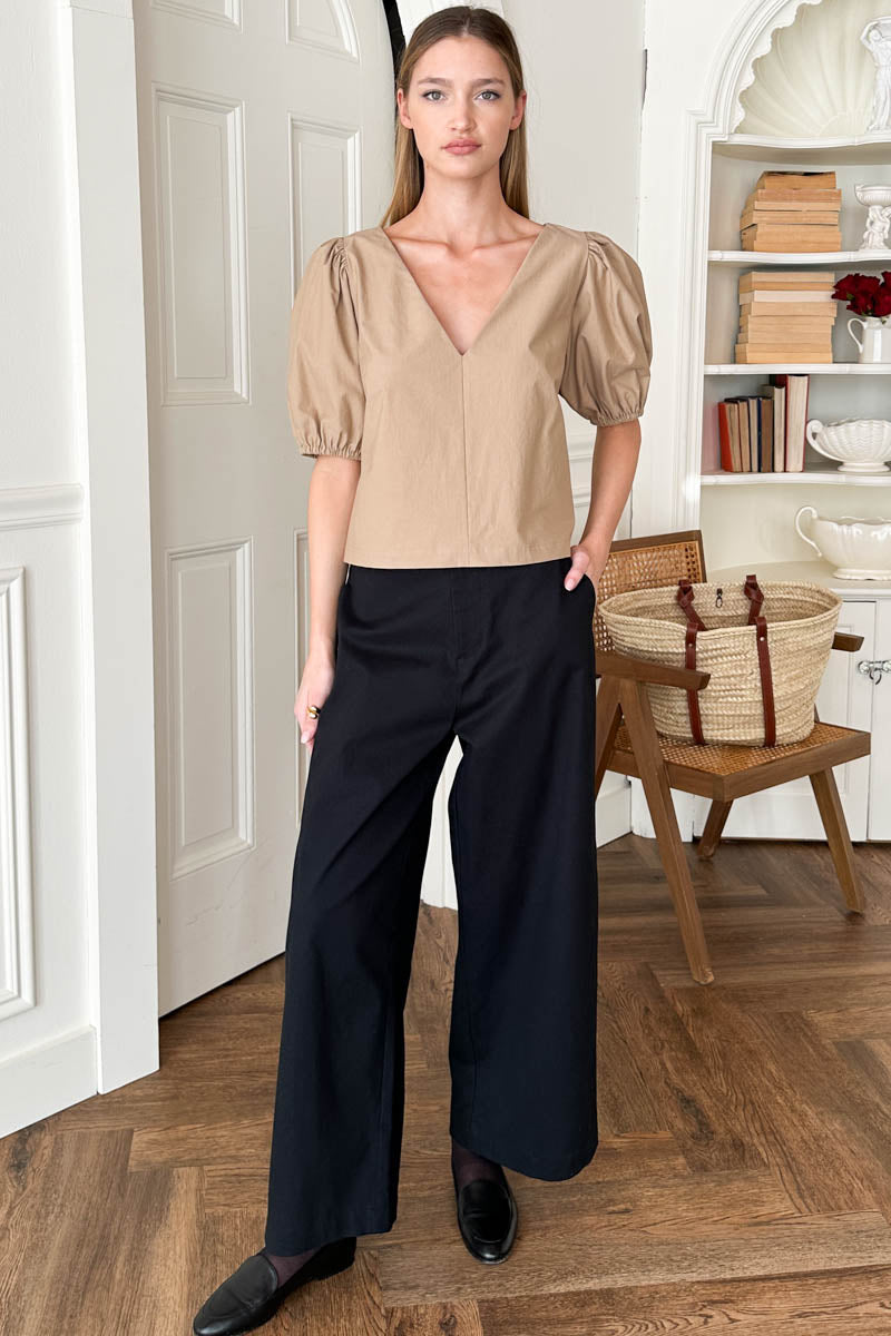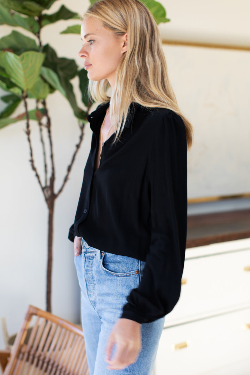 Comfy-polish or party-ready. With Jeans. Luxe-Comfortable, special, joyful. Made in NYC. 100% Organic Cotton from Japan Puff shoulder 7" Balloon sleeve w/ elastic cuff V front + back Lined Made...