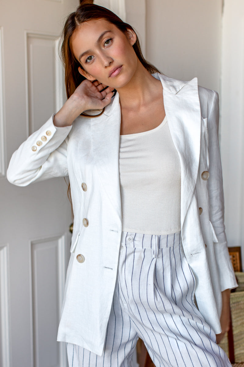 beautiful lapel, great shapes, menswear inspired. layer up down all seasons or wear w/ suit. Linen Menswear inspired Double breasted 6 button Blazer Light padding in shoulder Chest welt pocket...