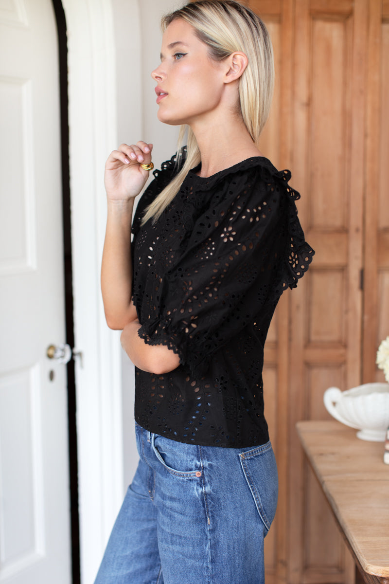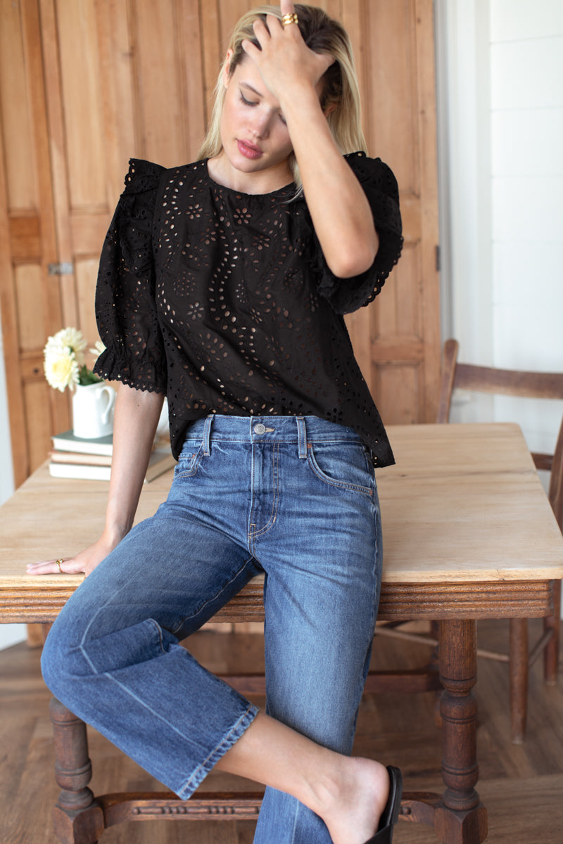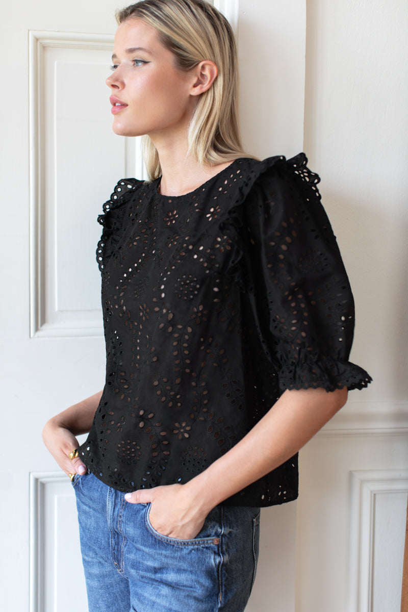 100% Cotton eyelet Short blouson sleeve with elastic ruffle cuff Flutter detail at shoulder Bound crew neckline Single button closure at back Model is wearing a size small Made in...