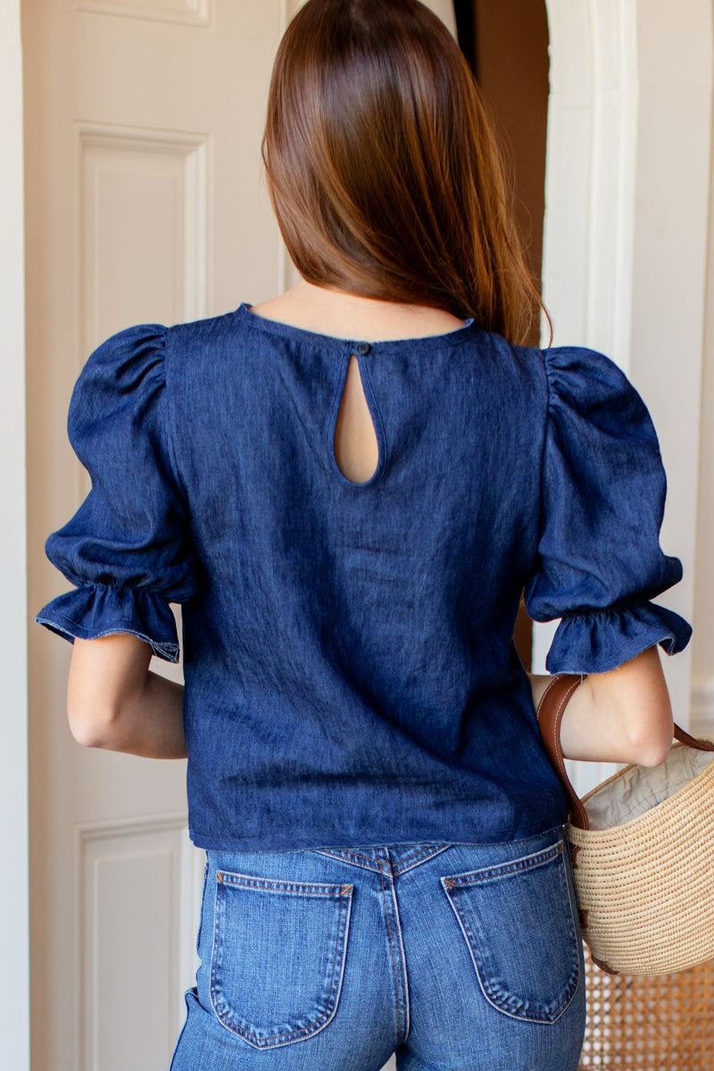 Organic cotton and hemp denim with broken in feel Raw edge detail at collar and hem Short blouson sleeve Elastic ruffled cuff with raw edge trim detail Subtle puff shoulder...
