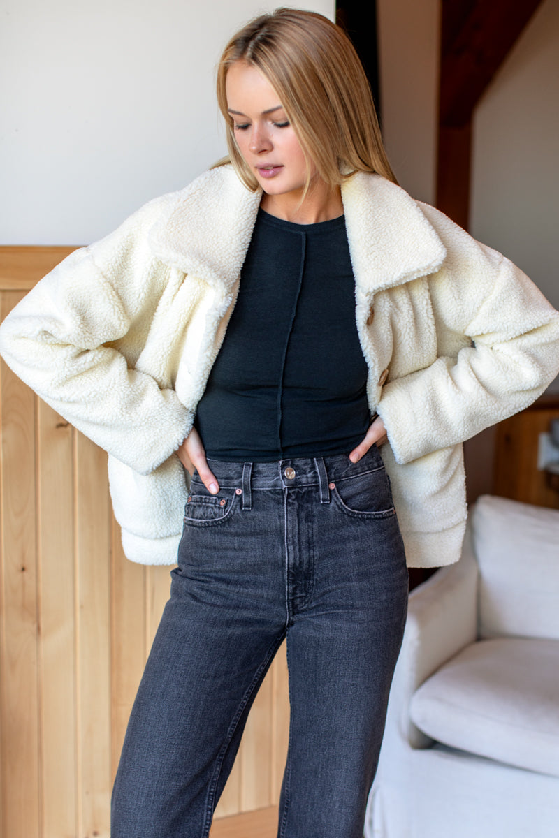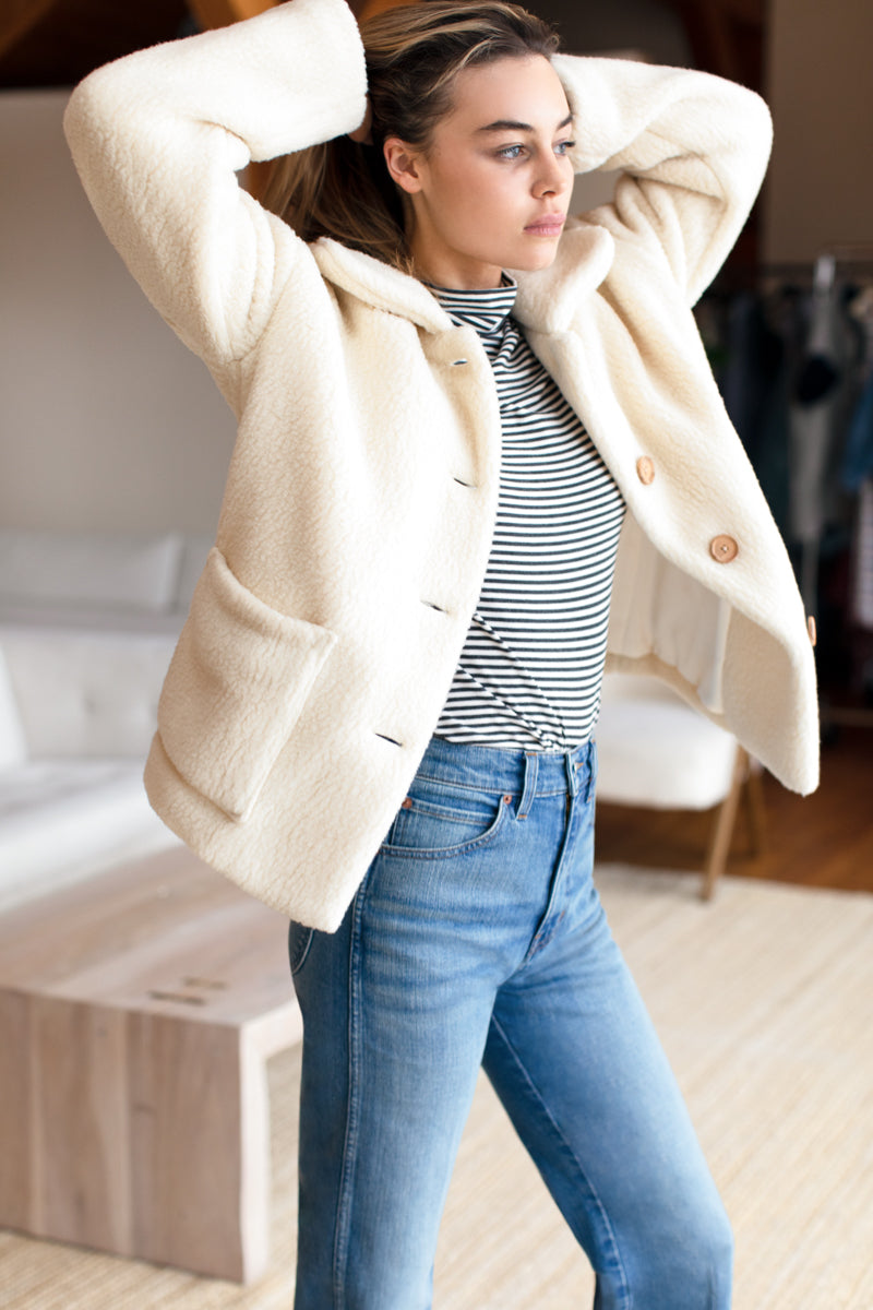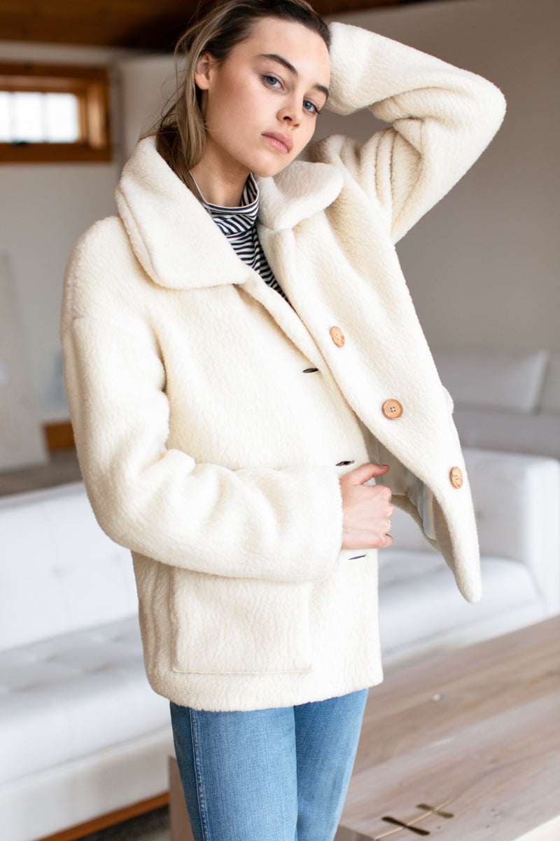 Sherpa Front patch pockets Button closure Bracelet length sleeve Center back length 33" (size small) Model is wearing a size small Boxy, drop shoulder fit Dry Clean Lined Made in...