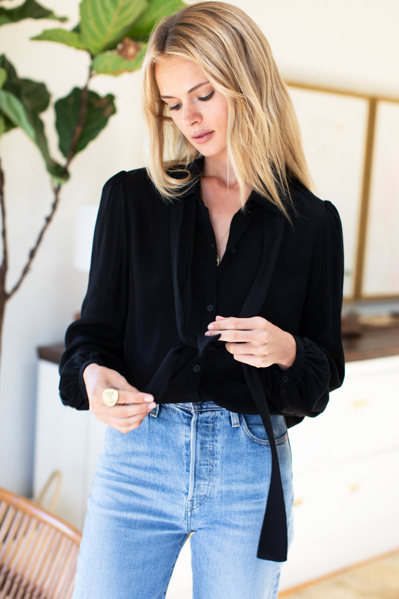 Sustainable Viscose Tie sash Set in puff shoulder Full button front closure Full length sleeves with button closure at wrist Model is wearing a size small Made in NYC Size...