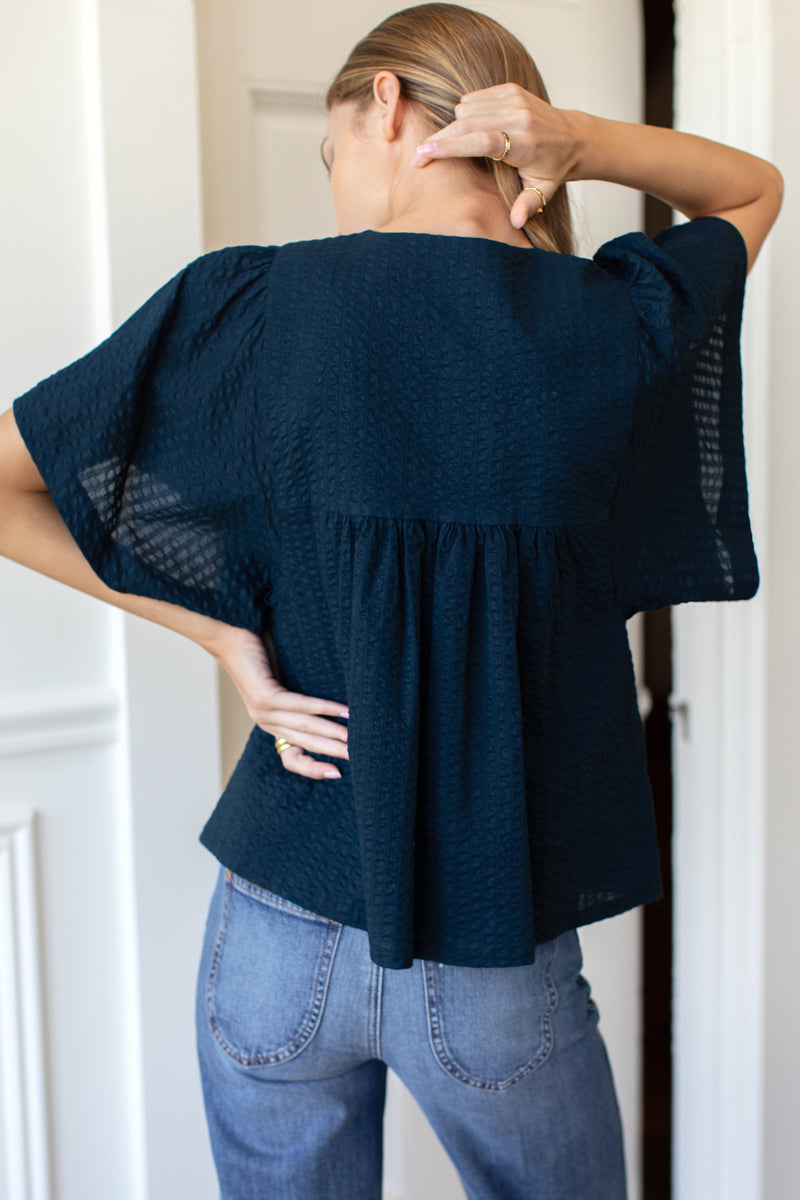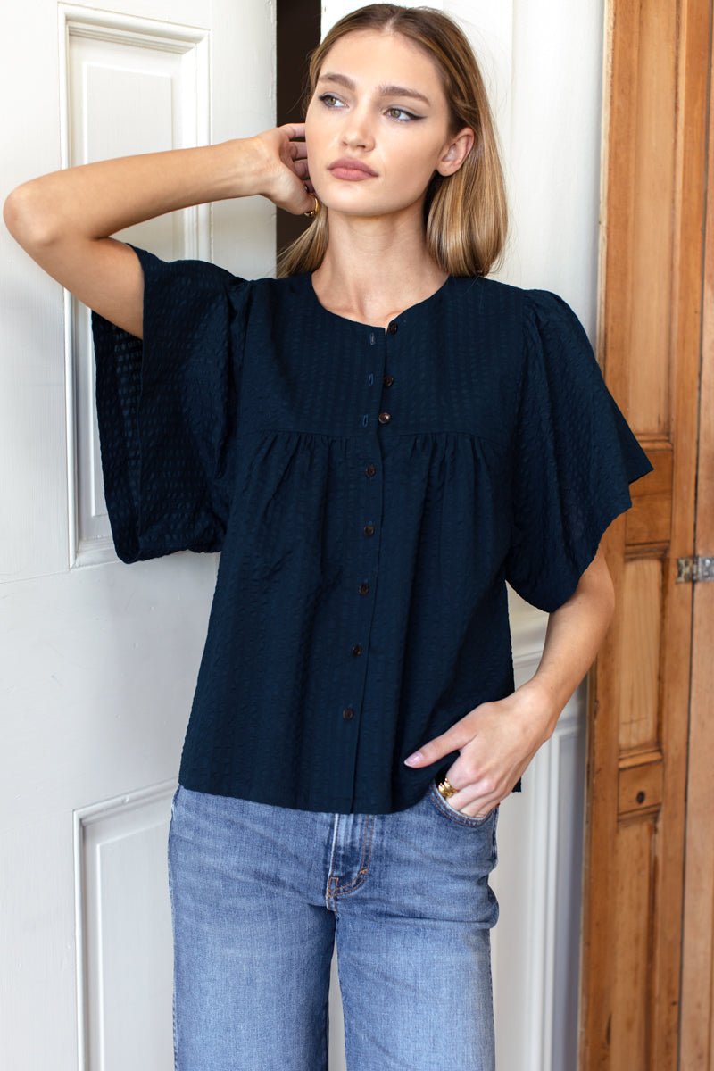 Cotton Textured weave Yoked neckline Gathers at shoulder Button front Fluttery style sleeves Relaxed fit through body Lined Made in NYC XXS: Bust 41", Length 21" XS: Bust 43", Length...