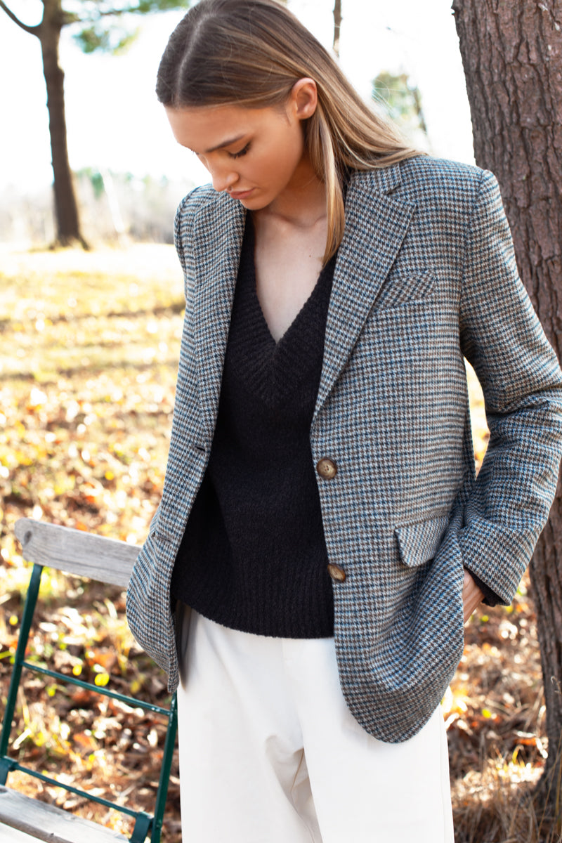 100% Cotton Tweed Menswear inspired blazer Two button closure Flap pockets with welt detail Notched collar Welt chest pocket Functional buttons at cuff Lightly padded shoulder Lined Rear vent Interior...
