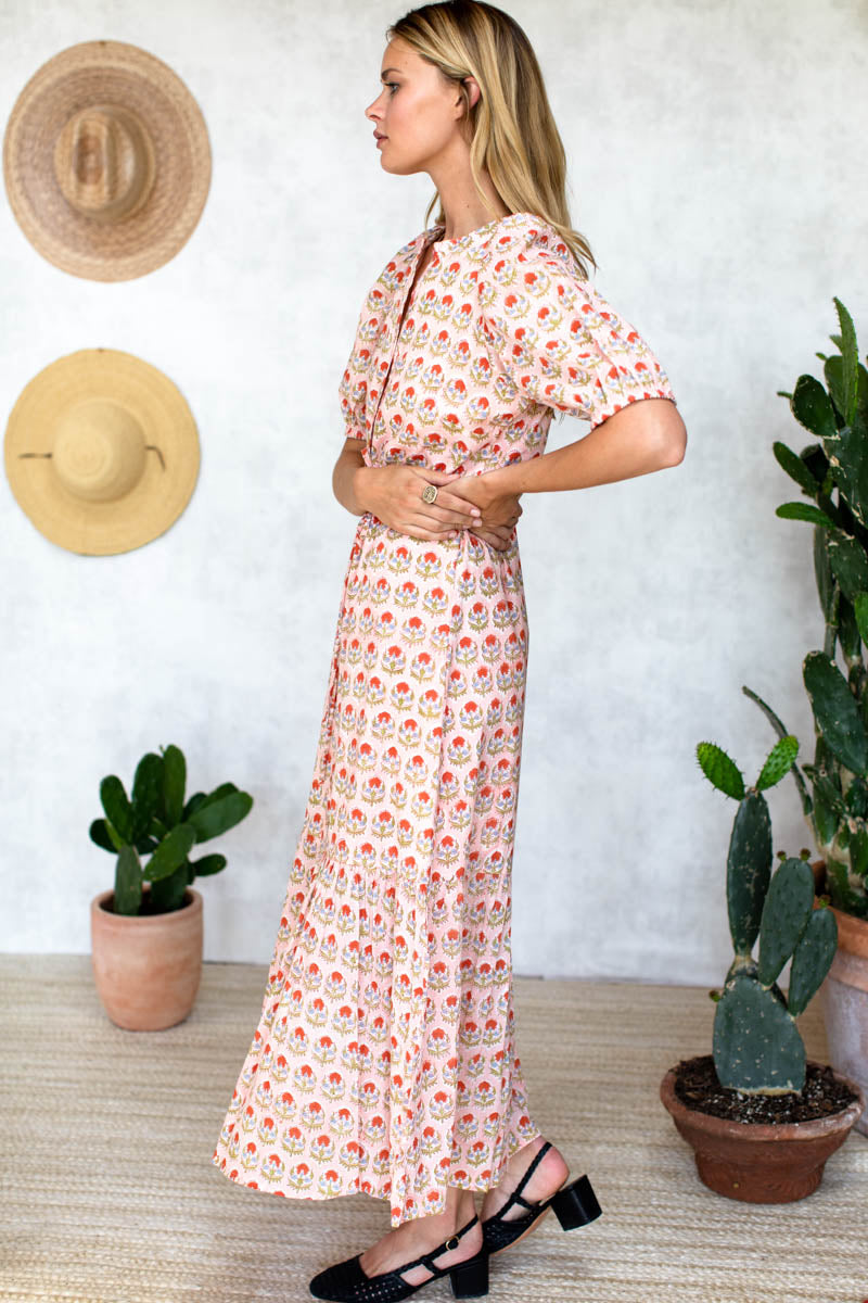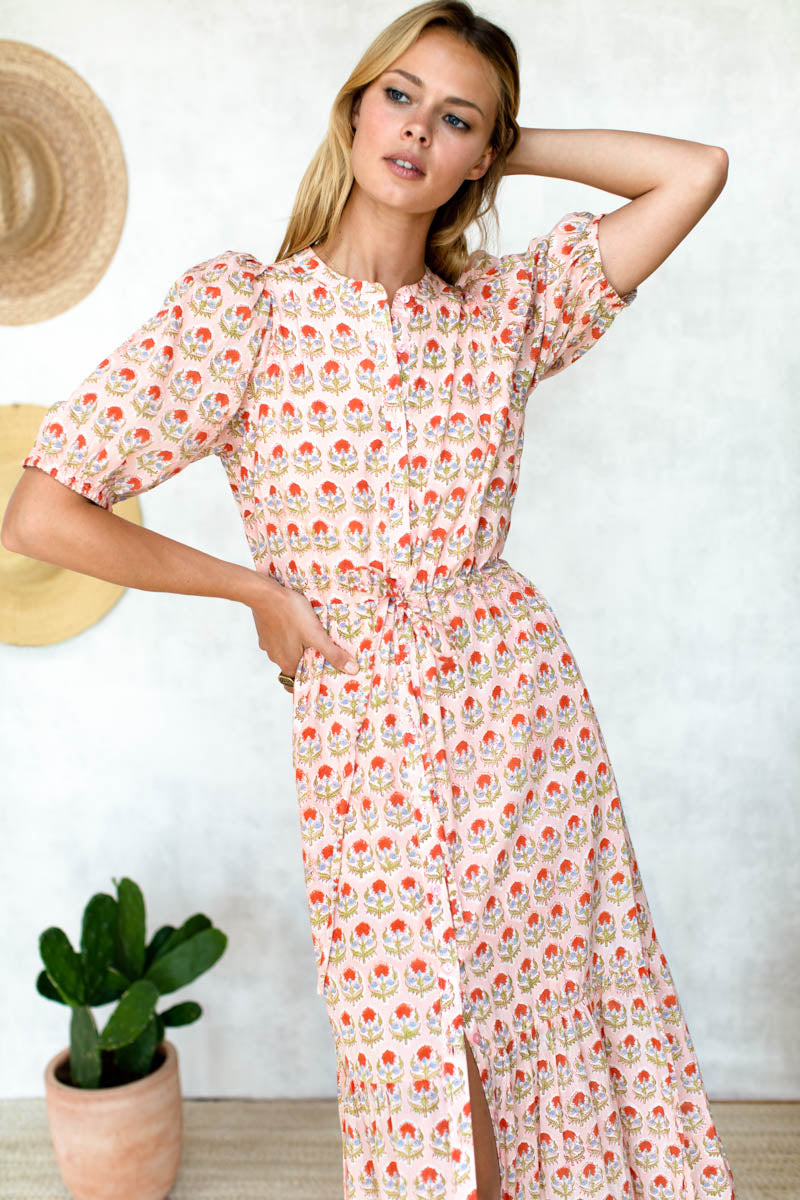 100% Organic Cotton Hand block printed using low impact dye Adjustable tie shoulder Shirred, Bound scoop neckline Button down front High, Gathered waist Removable sash tie Three tiered skirt Lined...