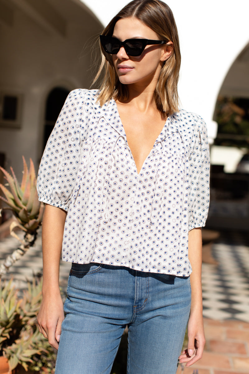 Satin Modal Hand-block printed using low impact dye Shirred, bound scoop neckline with tie closure Keyhole and button closure Bracelet length sleeves with button at cuff Lined Easy, breezy fit...
