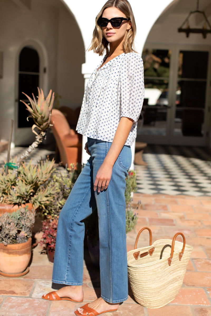 100% Organic Cotton Dobby cotton weave Bound scoop neckline Covered buttons at neckline and cuff Blouson Sleeve Ladder lace detailing Button closure and frill ruffle detail at cuff Unlined Made...