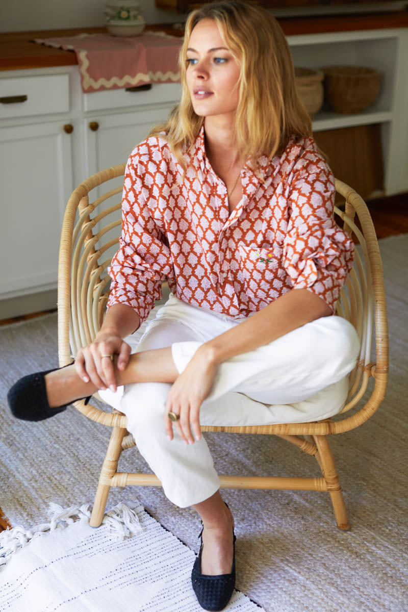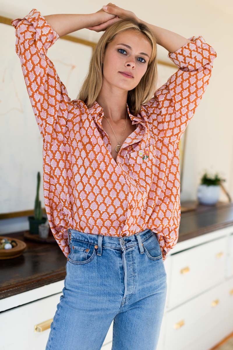 Made with 100% Organic Cotton Hand block printed using low impact dye Menswear inspired button down Hand embroidered chest pocket detail Button closure at cuff Full length sleeves Subtle shirt...