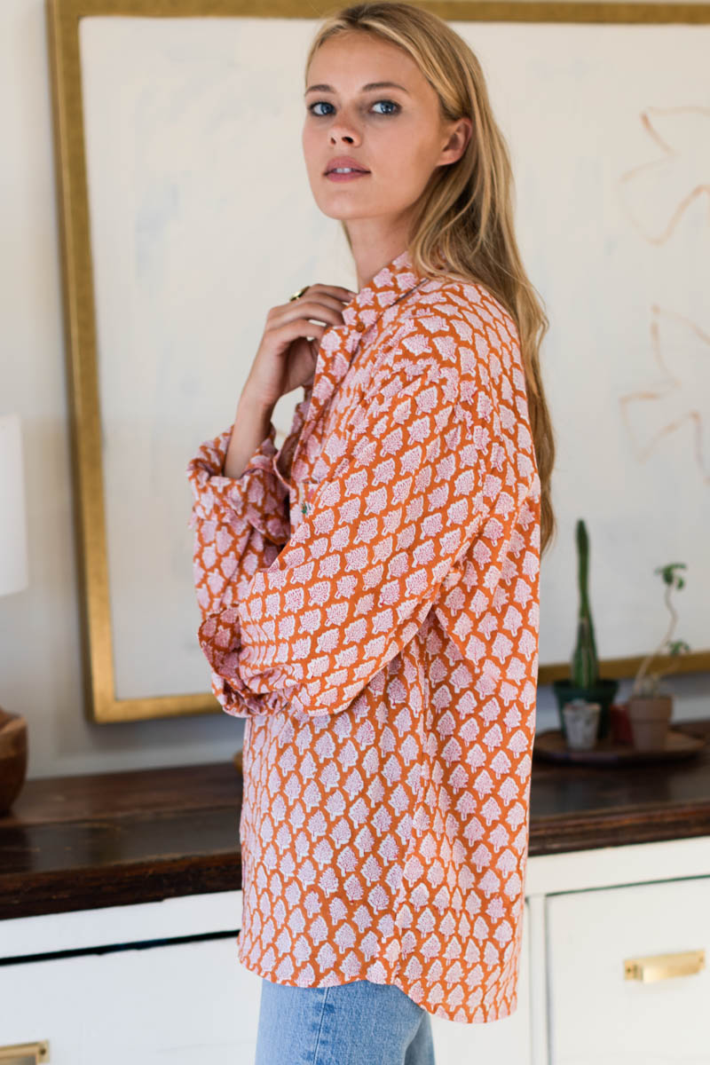 100% Organic Cotton Hand-block printed using low impact dye Shirred, bound scoop neckline Button front Blouson style, full sleeves with button cuff Straight hem Lined Easy, breezy fit Model is...