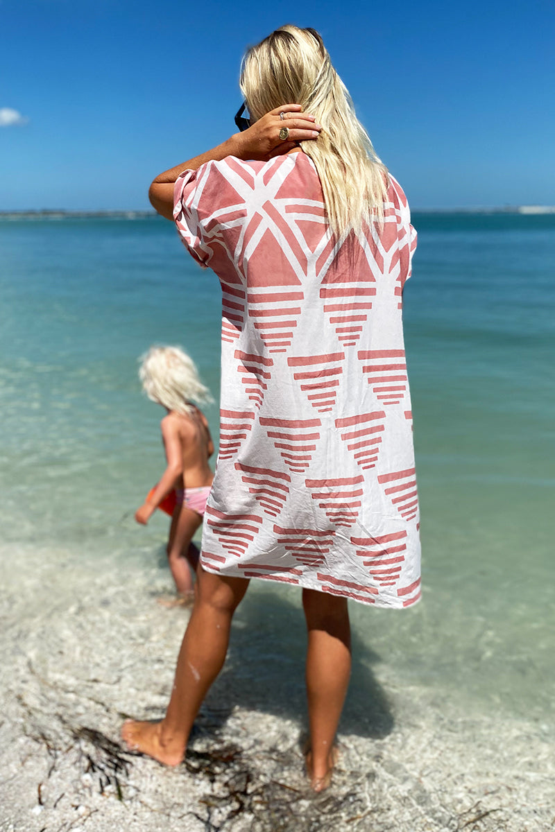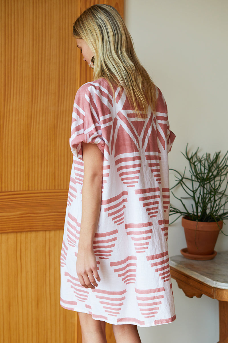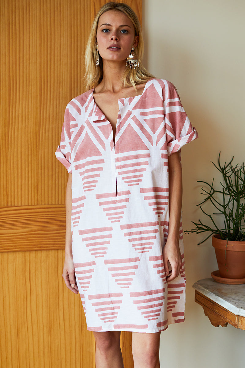 Organic cotton Hand block printed w/ low impact dye Easy/breezy fit Lined Model is 5'9" + wearing size xs/s Center back length 34" Neckline opening 9.5" w/ tie closures Nursing...