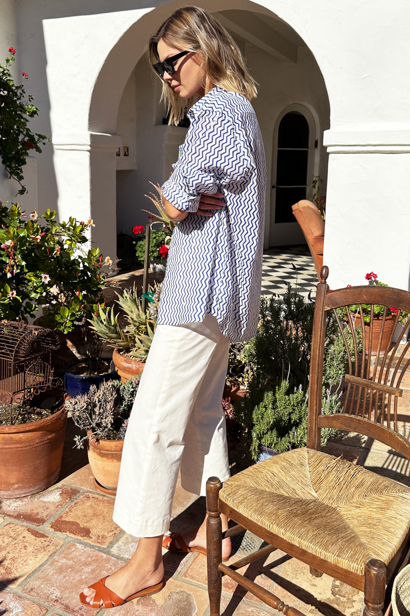 100% Organic Cotton Hand-block printed using low impact dye Shirred, bound scoop neckline Partial button front Blouson style sleeves w/ elastic cuff Straight hem Lined Easy, breezy fit Made in...