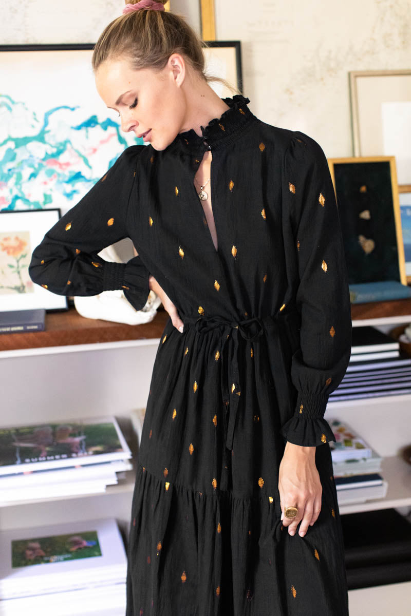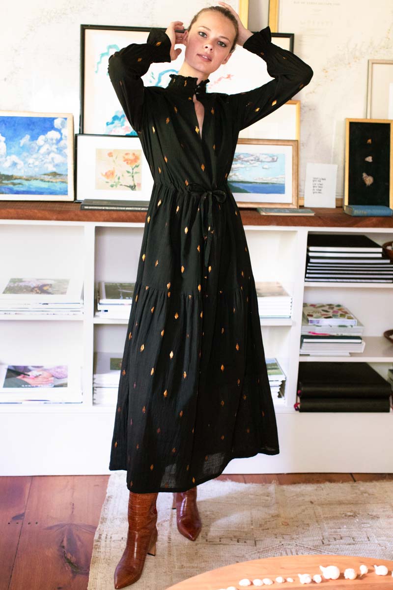Satin Modal Hand block printed w/ low impact dye Easy/breezy fit Ruffle at shoulder Lined Button closures on bodice Frill ruffle at neckline Drawstring waist Tiered ruffle hem Made...