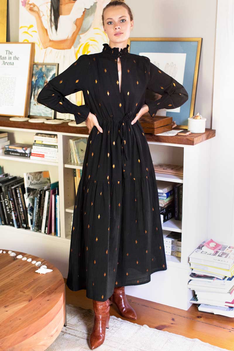 Good to have a little dress that’s airy + special + festive. Organic cotton Hand block printed using low impact dye Easy/breezy fit Center back length 34" Neckline opening...