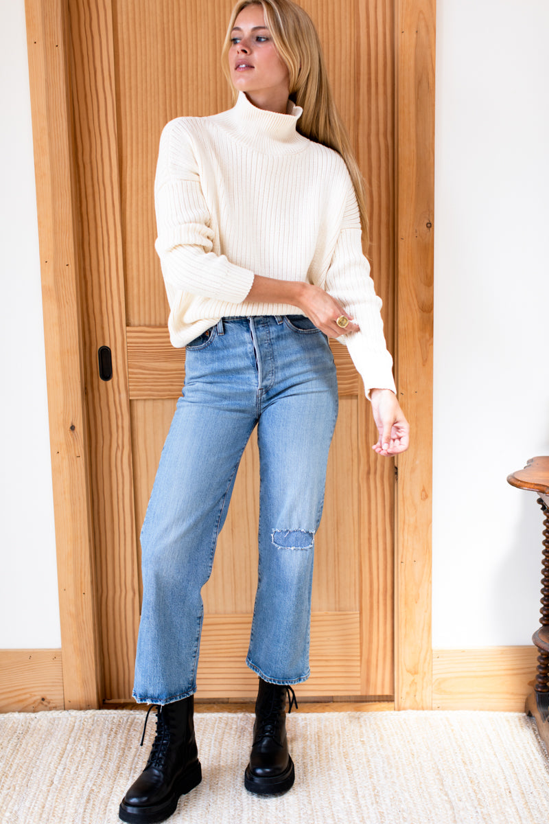Organic cotton Rib knit Drop shoulder Full length sleeve Funnel neck is 4 1/2" high Model is wearing a size small Hand wash and lay flat to dry Made in...