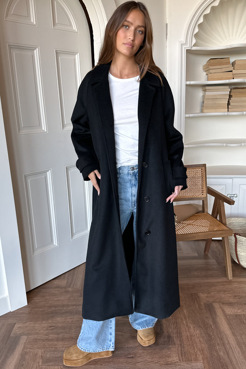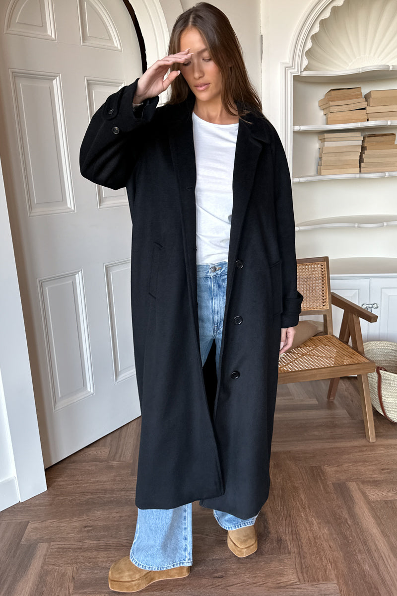 Wool cashmere Maxi length Button closures at front Notched lapel Raglan sleeves Adjustable cuff strap Angled welt pockets Lined Model is wearing a size large Made in NYC XXS: Bust...