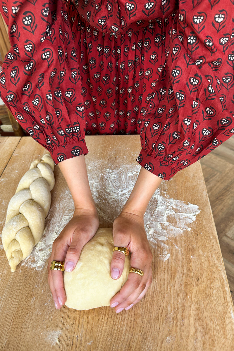 100% Organic cotton Hand block printed w/ low impact dye 11" Neckline opening w/ hook + eye closure Hidden interior waist tie for a more fitted look One size Center...