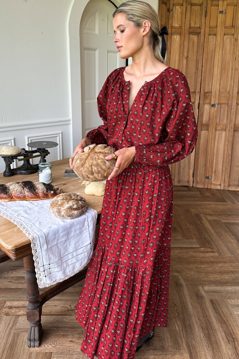 Favorite perfect fit maxi dress with updated size range and longer shirred bodice. Linen Viscose Shirred elastic bodice Button front Square neckline Elastic at shoulder and cuff Puff sleeve Ruffle...