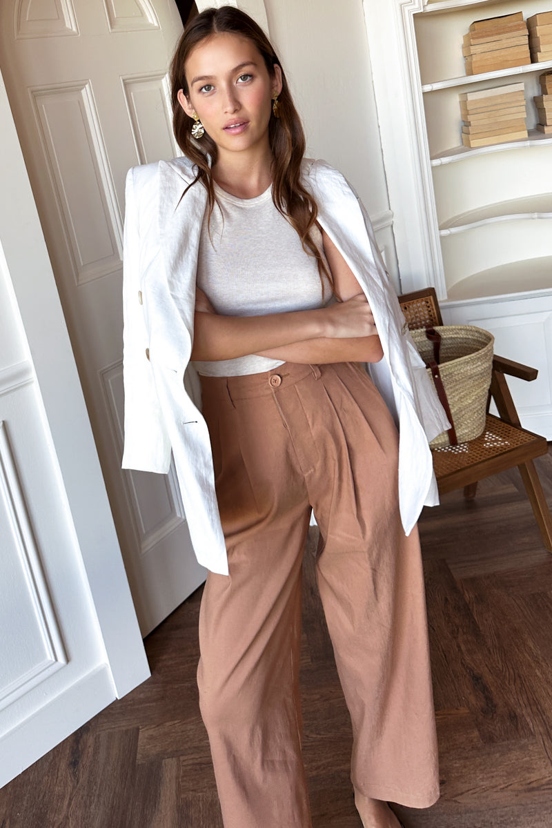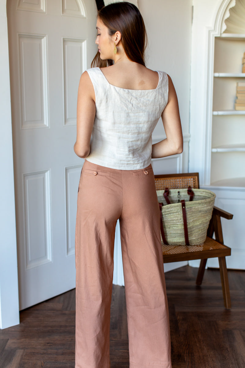 35% Linen, 65% Rayon blend Cropped ankle fit Features side seam pockets + back patch pockets Paper bag style elastic waist with tie closure Inseam 26.5" - size small Model...