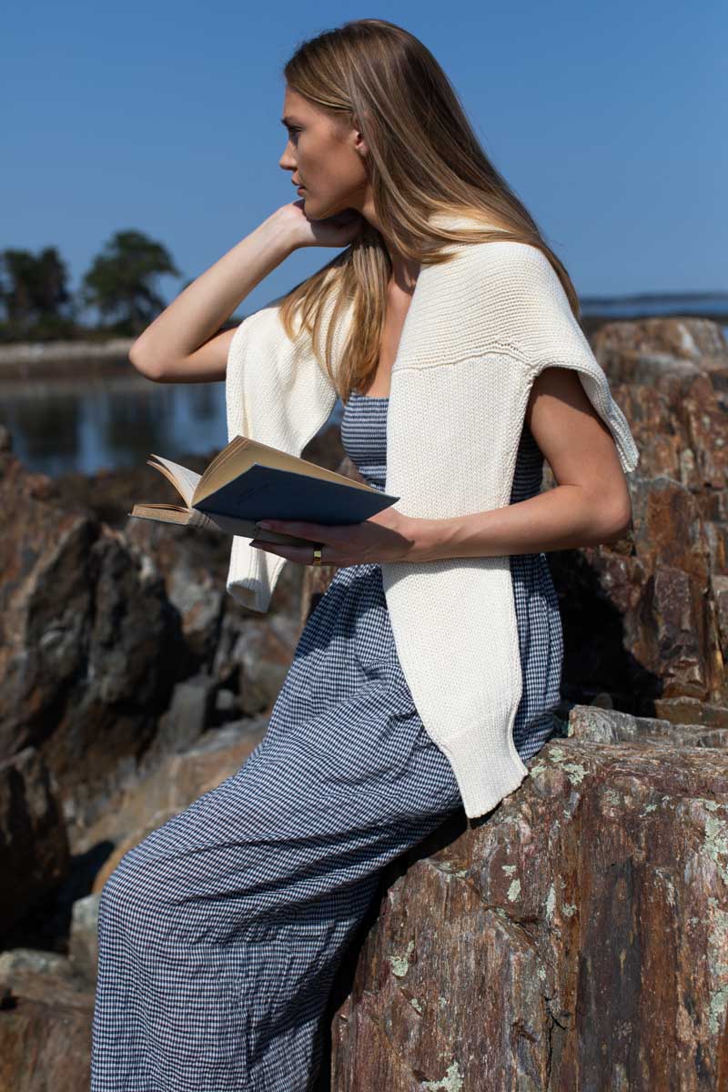 comfortable, wear-everyday dress in a timelessly feminine silhouette. cut in a relaxed, texturally soft, complex, rustic Japanese Gingham. side seam pockets, smocked elastic back panel for comfort and perfect fit...