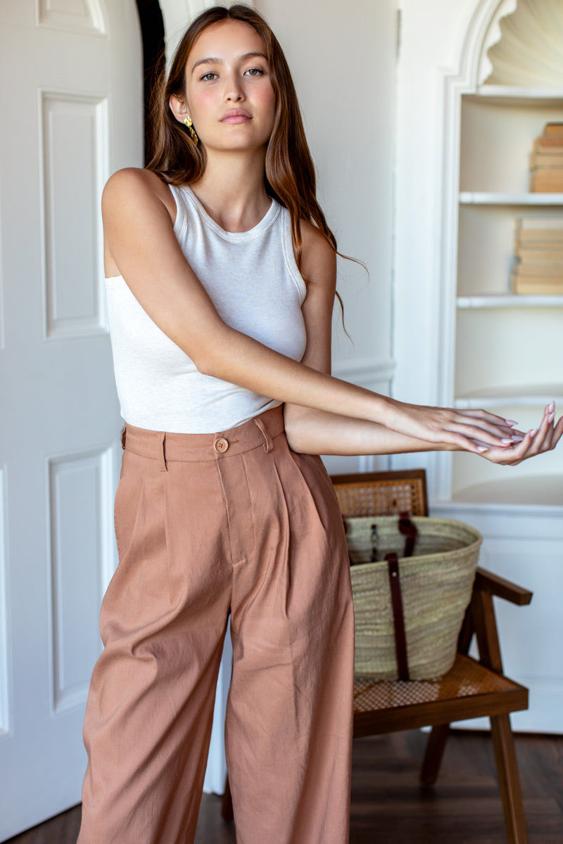 35% Linen, 65% Rayon blend Cropped ankle fit Features side seam pockets + back patch pockets Paper bag style elastic waist with tie closure Inseam 26.5" - size small Model...