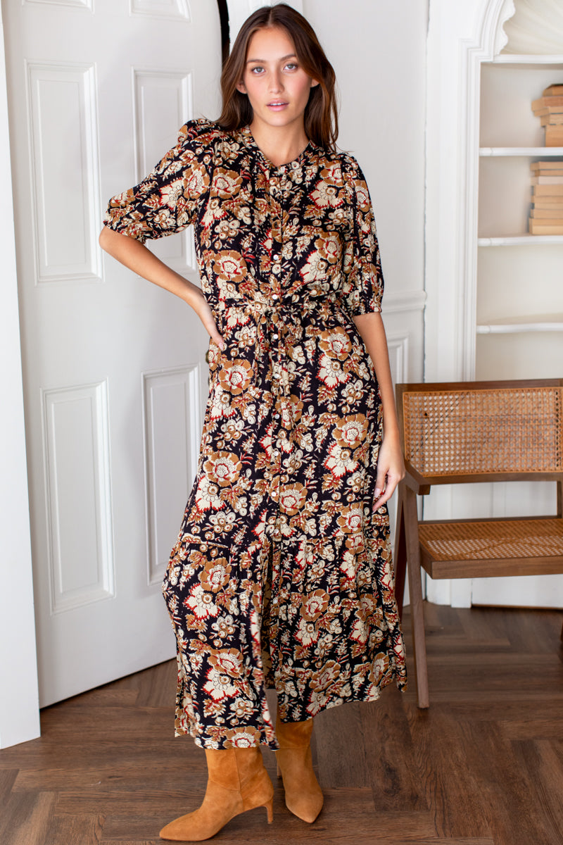Organic Cotton Hand block printed and dyed using low impact dye Button front shirtdress One size Mandarin style collar Pintuck detail Batwing style sleeve with button at cuff Unlined Transeasonal...