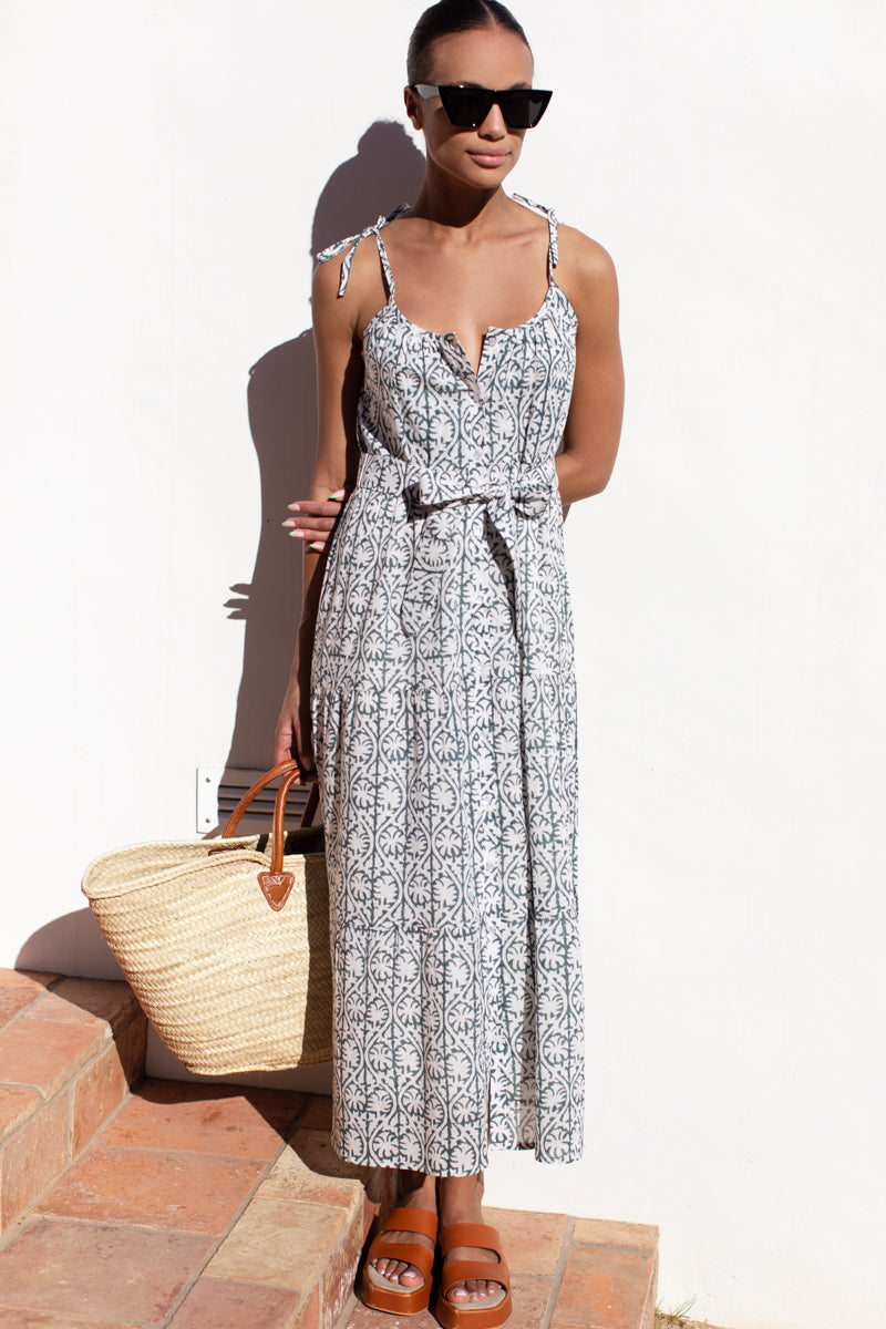 100% Organic Cotton Hand block printed using low impact dye Adjustable tie shoulder Shirred, Bound scoop neckline Button down front High, Gathered waist Removable sash tie Three tiered skirt Lined...