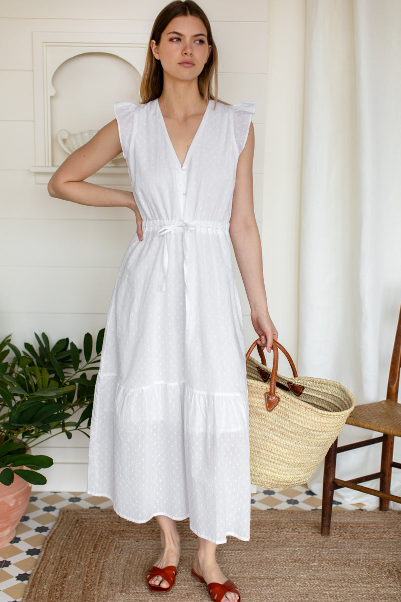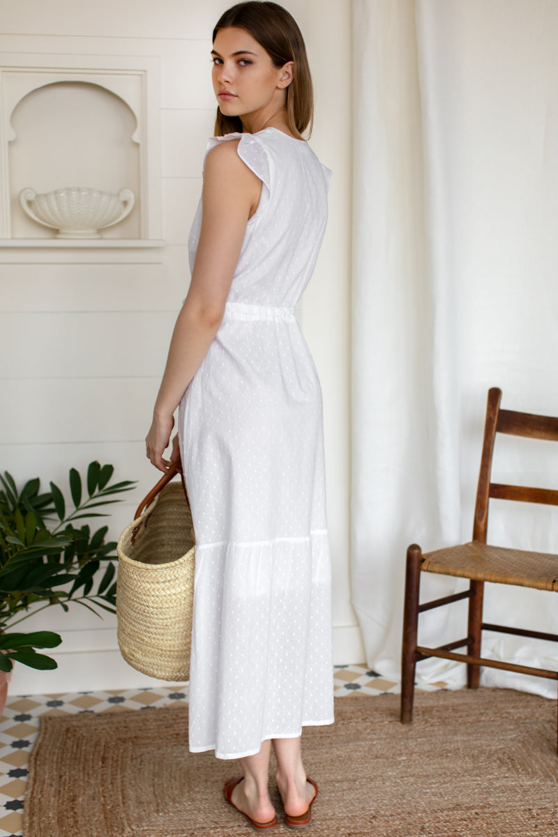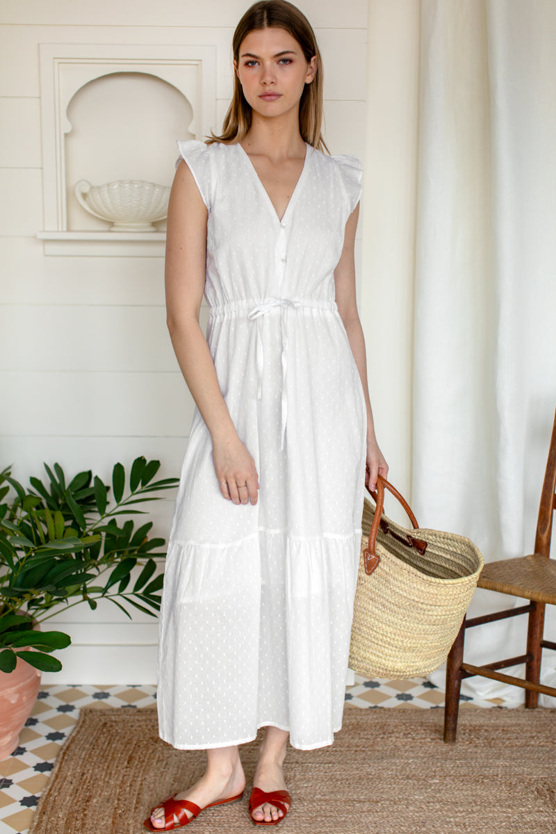 Organic cotton Swiss dot Adjustable drawstring waist Button down bodice Flutter ruffle at shoulder Tiered skirt Lined Made in Rajasthan, India XS: Bust 36", Hip 44", Length 52" S:...