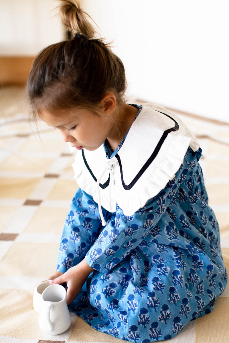 Organic Cotton Peter Pan style collar with ruffle trim Snap closure at back Tie closure at front Made in Rajasthan, India