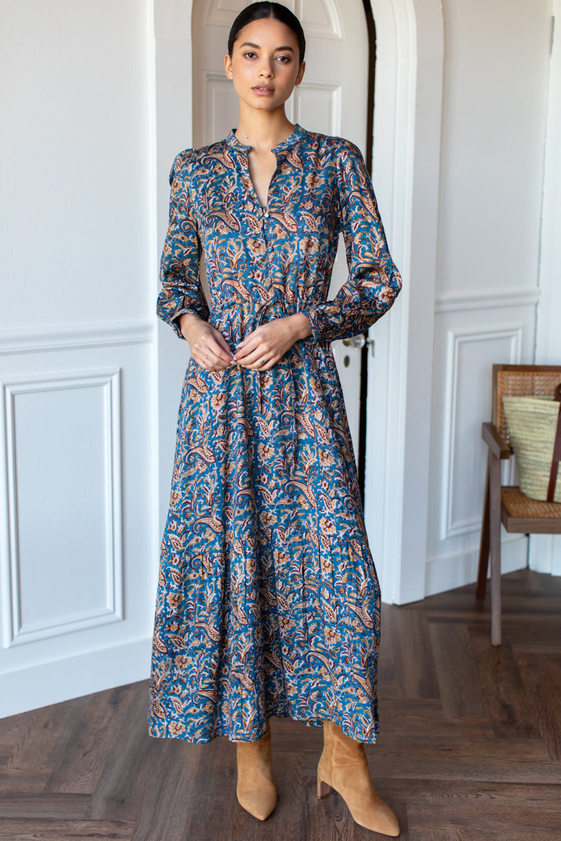 Satin Modal Hand block printed w/ low impact dye Easy/breezy fit Set in sleeve with gathers at shoulder Lined Button closures on bodice Modesty placket under buttons Mandarin style collar ...