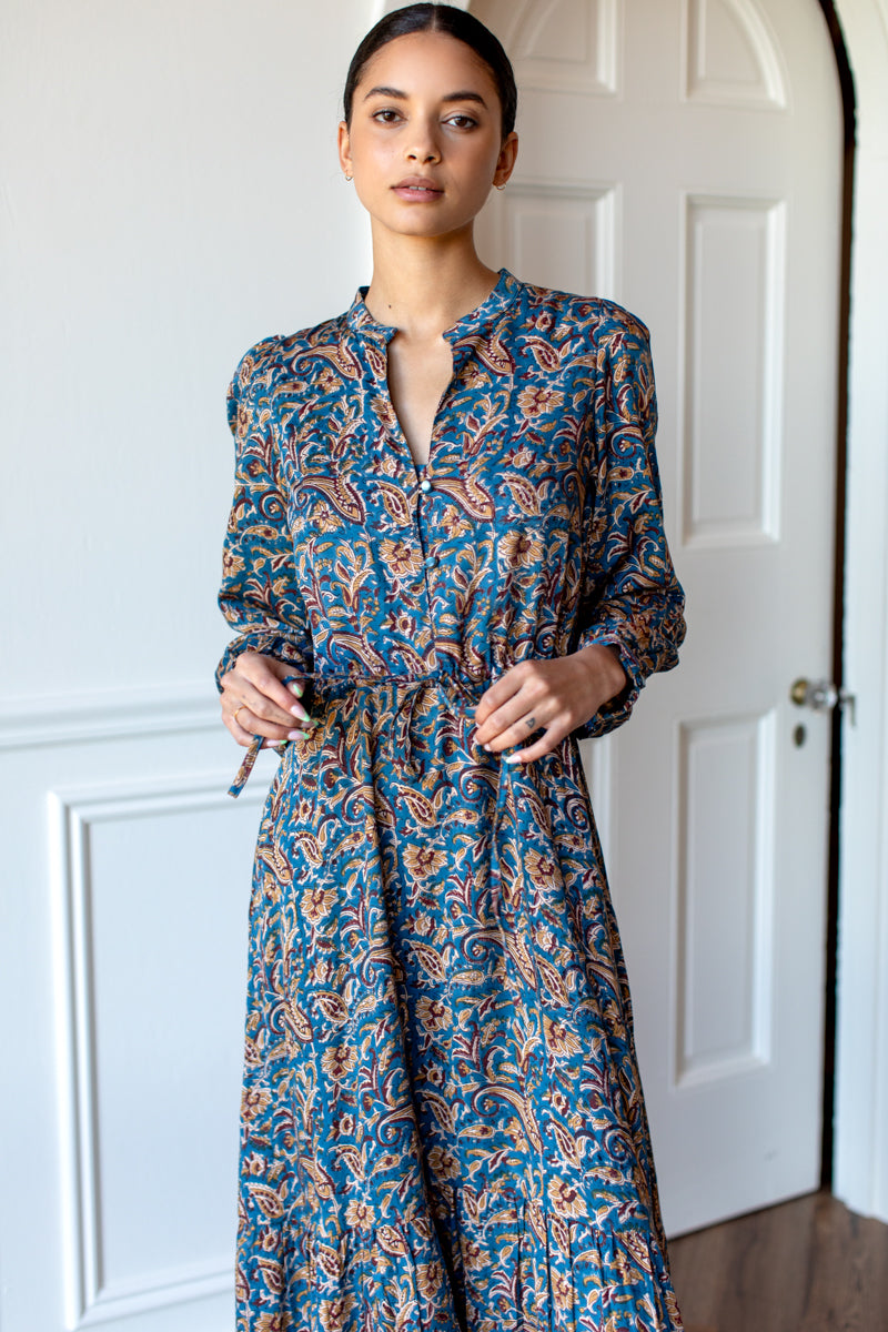 Organic Cotton Hand block printed and dyed using low impact dye Button front shirtdress One size Mandarin style collar Pintuck detail Batwing style sleeve with button at cuff Unlined Transeasonal...
