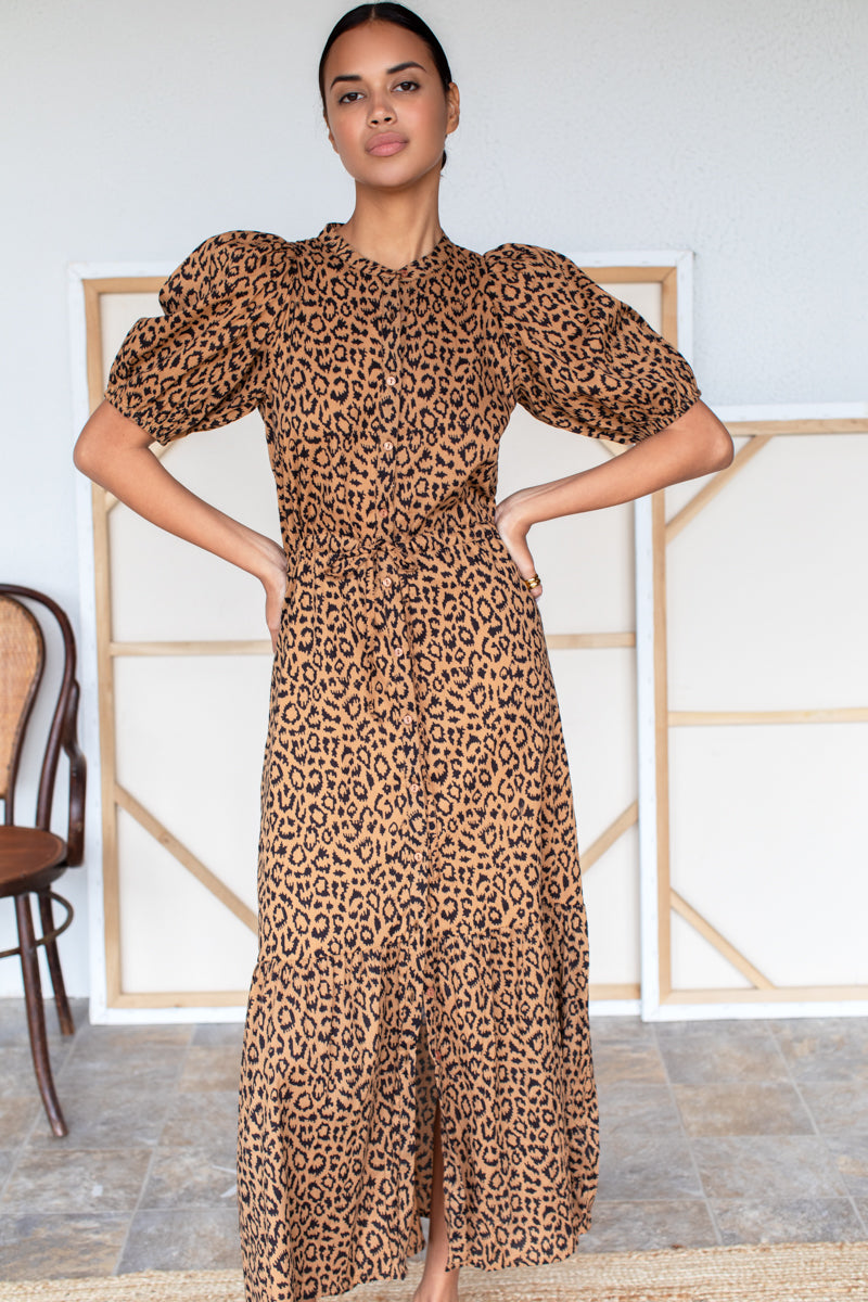 Satin modal Hand block printed using low impact dye Shirred elastic bodice Button front Square neckline Elastic at shoulder and cuff Puff sleeve Ruffle hem Lined Made in Rajasthan, India...