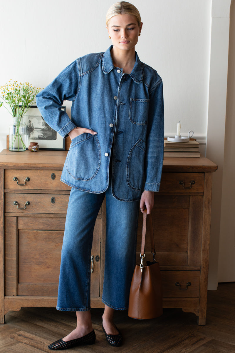 Introducing our Cabin Jacket, a perfect blend of adventure and comfort in 100% cotton Italian denim in a vintage shade. Its relaxed, longer silhouette provides coverage and freedom of movement...