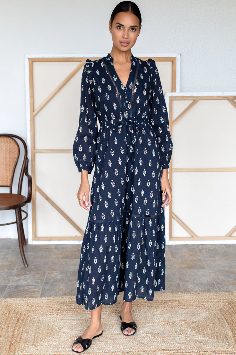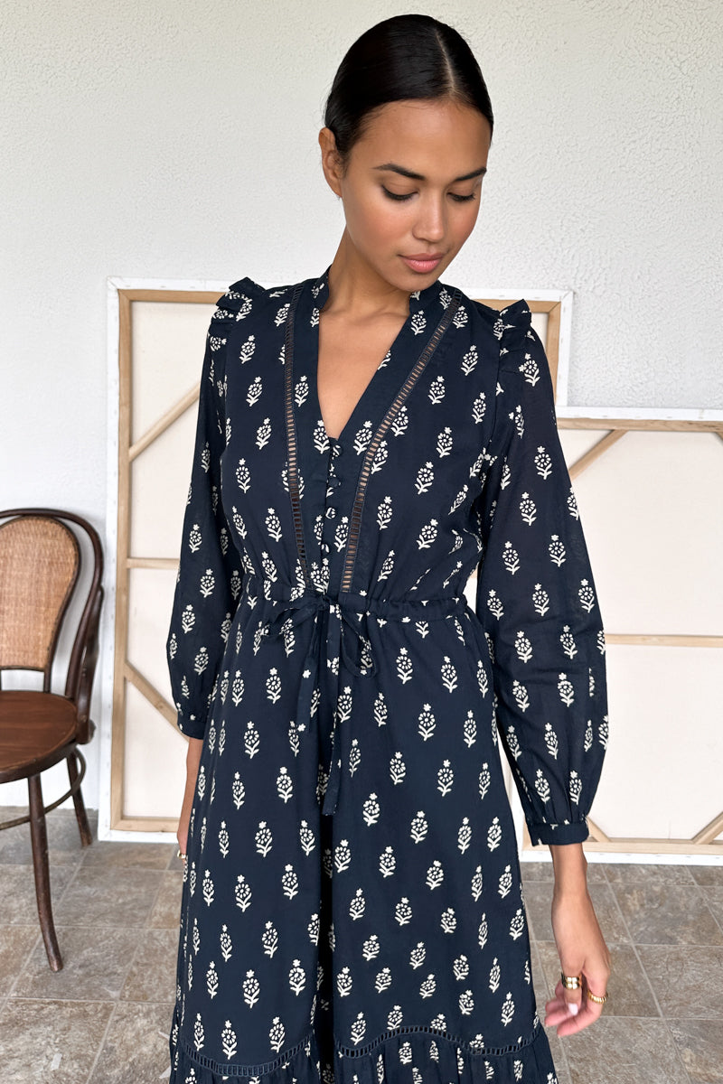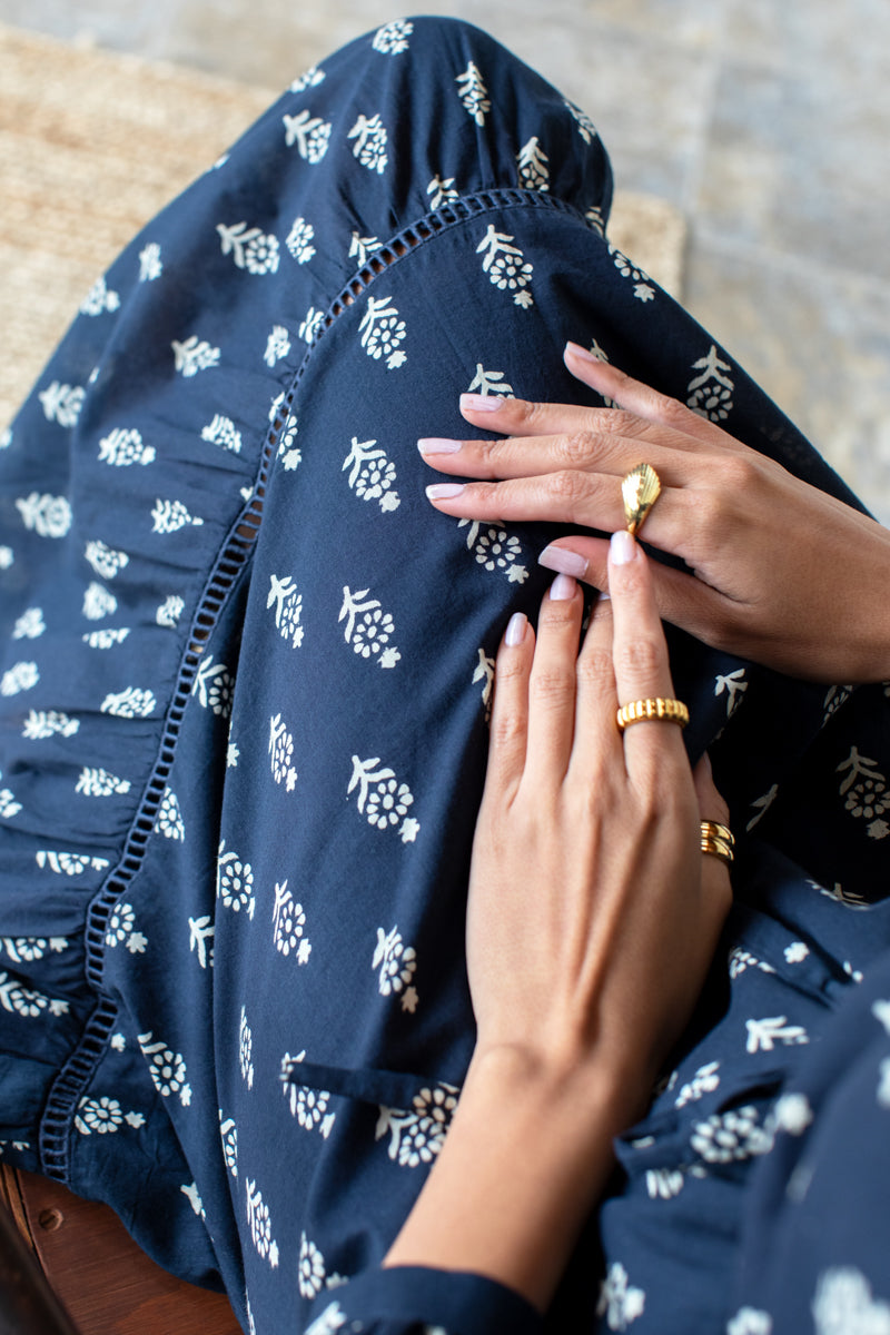 Organic Cotton Hand block printed w/ low impact dye Frill ruffle at shoulder V neckline with stand collar Ladder lace detailing at bodice & skirt tier Set in sleeve w/...