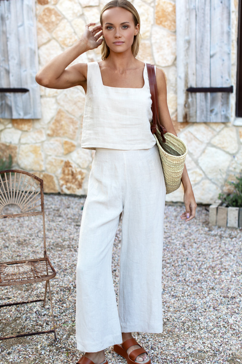 Linen viscose blend High Waisted Wide leg fit Side seam zipper Inset covered elastic panel at center back Darts at waist Model is 5'10 Made in NYC XXS: Waist 23",...